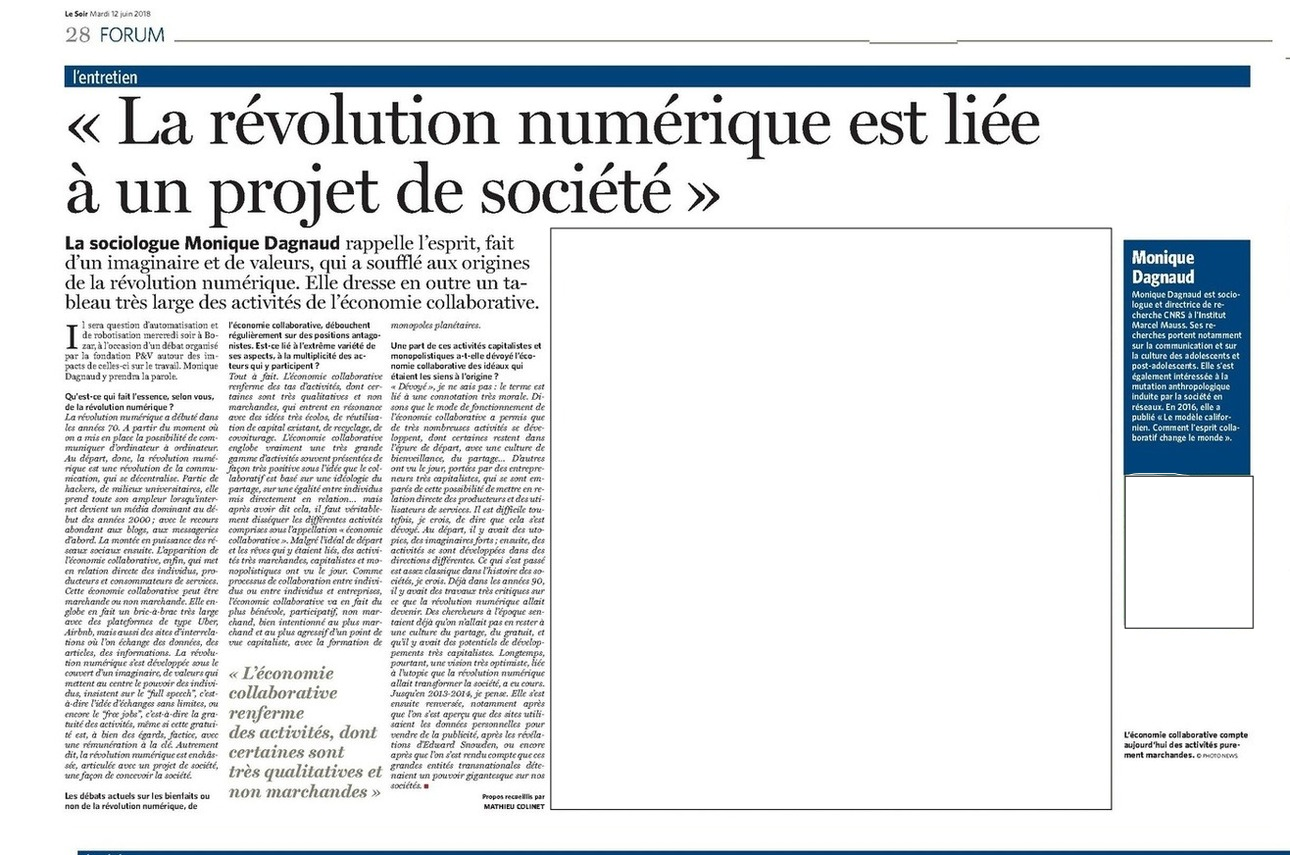 - Le Soir, "La r├®volution num├®rique est li├®e ├á un projet de soci├®t├®", 12/06/2018, le Soir l'entretien, Mathieu Colinet, pp.28